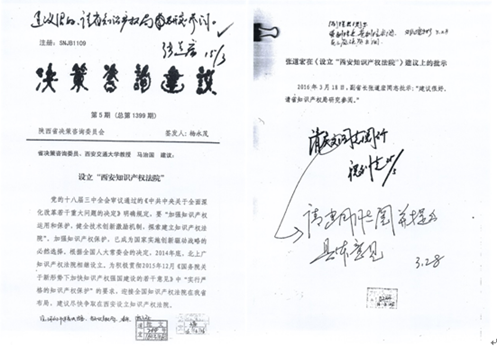 据了解,《设立“西安知识产权法院”》的建议刊发在《决策咨询建设》2016年第5期上。祝列克书记、张道宏副省长和省高级人民法院阎庆文院长分别作出批示并得到娄勤俭书记的关切。马治国教授在该建议中指出,由于“一带一路”建设和创新发展环境建设的需要,完全可以通过在西安建设知识产权法院辐射中西部地区,同时,西安建设知识产权法院不仅有政策依据和先期探索,同样具备专业人才的雄厚基础,应当尽快向国家有关部门提出申请,尽快设立。新华社《内参》和《瞭望》杂志也分别刊发了与该建议的有关的内容。