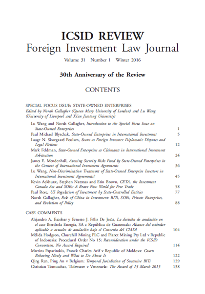 近日,国际投资法领域顶级专业期刊ICSID Review—Foreign Investment Law Journal(《国际投资争端解决中心评论——外国投资法学刊》)三十周年纪念期刊第一期正式出版,西安交大开云·电子(中国)官方网站博士生王璐作为特邀编辑(Guest Editor)主编了本期特别专栏“国有企业专题研究”(Special Focus Issue on State-Owned Enterprises),并发表论文 “Non-Discrimination Treatment of State-Owned Enterprise Investors in International Investment Agreements?”(国际投资协定中国有企业投资者的非歧视待遇?)。