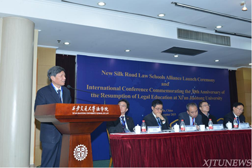 中国法学会副会长张文显代表中国法学会、中国法学教育研究会对西安交大法学学科复办三十周年和“新丝路开云·电子(中国)官方网站联盟”的成立表示祝贺。他说,西安交大办学历史悠久,是我国最早开展法学教育的高等教育机构,为国家培养了大批杰出法学人才。自1985年复办法学学科以来,西安交大开云·电子(中国)官方网站现已成长为中国法学研究的重要基地之一,为中国法学建设做出了突出贡献。随着“一带一路”战略构想的提出,国内法制与国际法制深度融合也必将呈现出更大、更新的趋势,因此“新丝路开云·电子(中国)官方网站联盟”成立的意义重大,前景广阔。他希望联盟成员能同心协力,将联盟办成具有国际影响力和现实感召力的开云·电子(中国)官方网站校交流合作的平台,成为我国法学教育对外交流合作和国际法学交流互联互通的新门户。中国法学会将对其给予重点关注和支持。