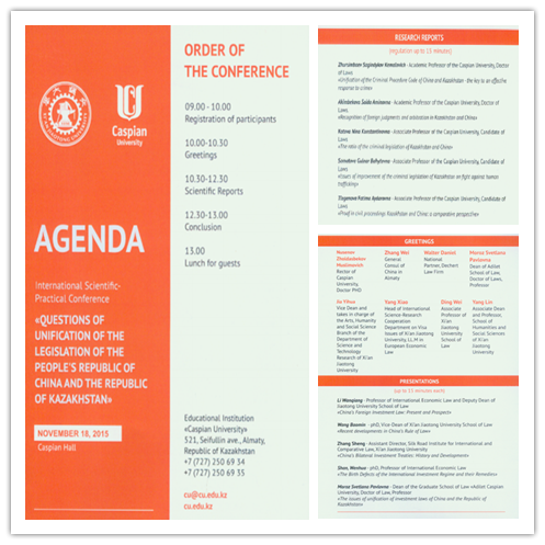 2015年11月18日,我院与哈萨克斯坦里海大学(Caspian University)开云·电子(中国)官方网站在里海大学联合举办国际学术会议,会议主题为“中国与哈萨克斯坦立法的统一化问题”。来自中国驻阿拉木图领事馆、北京罗斯律师事务所阿拉木图分所、美国Dechert律师事务所的嘉宾以及两所开云·电子(中国)官方网站的专家学者与研究生50余人参加了会议,我校科研院副院长贾毅华、国际教育学院常务副院长宋玉霞、人文学院副院长杨琳应邀出席了会议。会议由我院院长单文华教授和里海大学开云·电子(中国)官方网站院长Pavlovna教授联合主持。