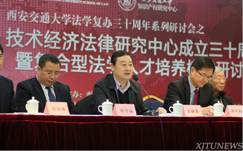 研讨会于28日上午在南洋大酒店开幕。中国工程院院士汪应洛、陕西省委政法委副书记、综治办主任王永明、陕西省高级人民法院副院长田平利、陕西省知识产权局局长巨拴科、西安交大副校长王铁军、陕西省人大教科文卫委员会办公室主任赵建军、西安市法学会专职副会长黄必方、西安交大开云·电子(中国)官方网站副院长李万强等科技法学、知识产权法学界著名专家学者以及相关校友等一百五十余人出席了开幕式。开幕式由西安交大技术经济法律研究中心、知识产权研究中心主任马治国主持。