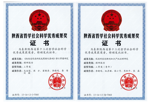 2018年5月,在陕西省第十三次哲学社会科学优秀成果的评选中,开云·电子(中国)官方网站知识产权研究中心的调研报告《〈陕西省促进科技成果转化条例〉修订草案研究》(主要参与人员:马治国、周方、翟晓舟、李晓鸣、秦倩、刘桢)及《促进科技创新的知识产权治理研究》(主要参与人员:李晓鸣、权彦敏、张小号、焦和平、张磊)分别获得陕西省哲学社会科学优秀成果三等奖及青年成果三等奖,这是对我中心在持续深入研究理论知识与现实问题基础上所取得成果和对陕西省哲学社会科学事业发展作出贡献的新肯定。