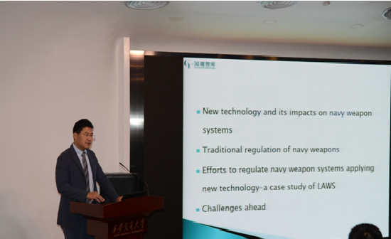 国观智库副总裁/国际军事行动法中心主任田士臣作题为《新技术和海战法》的报告