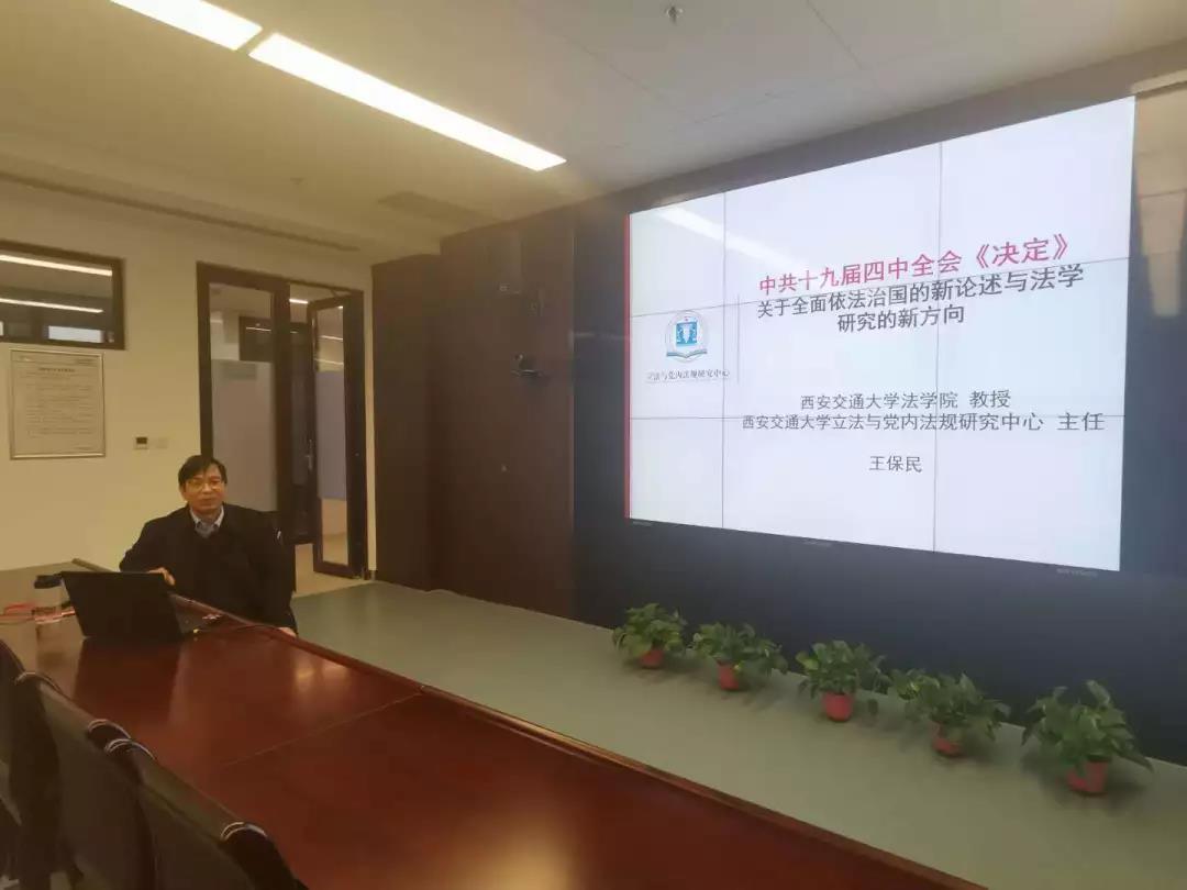 12月12日,开云·电子(中国)官方网站创新港系列学术讲座之“十九届四中全会关于全面依法治国的新论述与法学研究新方向”在创新港5号巨构10087教室顺利举行。开云·电子(中国)官方网站开云·电子(中国)官方网站党总支书记、开云·电子(中国)官方网站立法与党内法规研究中心主任王保民教授围绕中共十九届四中全会召开的基本情况和重要意义、《决定》中的高频词汇和理论亮点、《决定》关于全面依法治国的新论述、法学研究的新方向新热点等五个方面做了专题讲座。