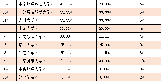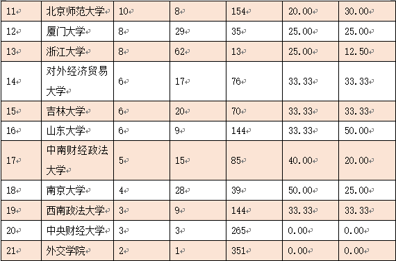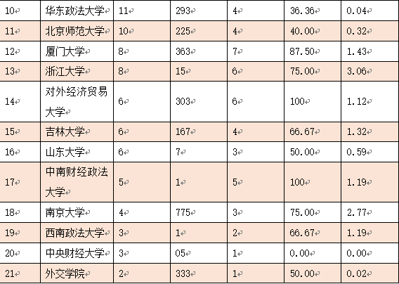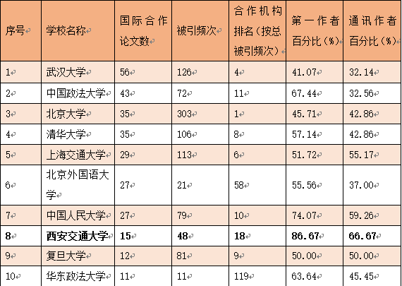(数据和表格信息来源:中国政法大学“法治科学计量与评价中心”官方微信公众号,原文题目为《我国首批涉外法律人才教育培养基地建设情况——国际合作论文分析》)